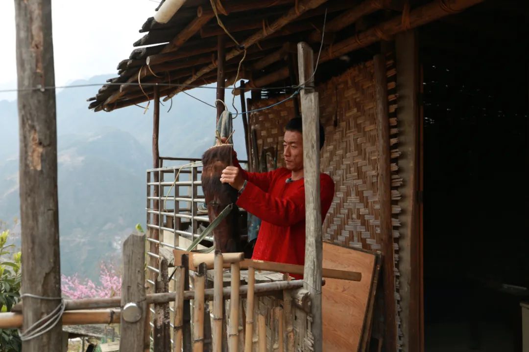 村民大多居住在传统的木制千脚楼里,面向开阔的山河峡谷,视野非常宽广。带着农耕生活特征的千脚楼通常是一楼养鸡、鸭、猪等牲口,二楼住人。在我们到访的下午,沙瓦村村民热情地杀了3只鸡,新鲜的“食材”正在锅里冒着热气,它们的“同伴”就隔着地板在脚下窜来窜去,多少有点魔幻。