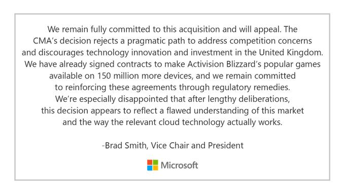 我们已经签署了合同,让动视暴雪的流行游戏可以在1.5亿台以上的设备上使用,我们仍然致力于通过监管补救措施来加强这些协议。我们尤其感到失望的是,经过长时间的考虑,这个决定似乎反映了(CMA)对这个市场以及相关云技术实际工作方式的错误理解。