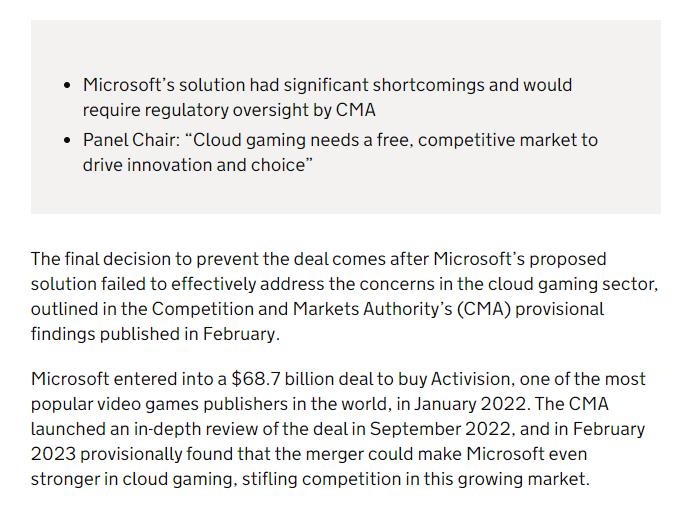 4月24日周三,英国最高监管机构英国竞争和市场管理局(CMA)发布声明称反对微软收购动视暴雪,理由是这笔交易损害了云游戏市场的竞争。