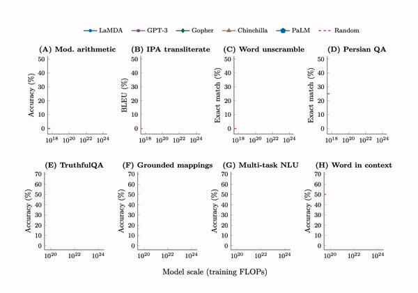 2022年,来自Google、DeepMind、斯坦福和北卡莱罗纳大学的学者分析了GPT-3、PaLM、LaMDA等多个大模型[3],发现随着训练时间(FLOPs)、参数量和训练数据规模的增加,模型的某些能力会“突然”出现拐点,性能肉眼可见地骤然提升。