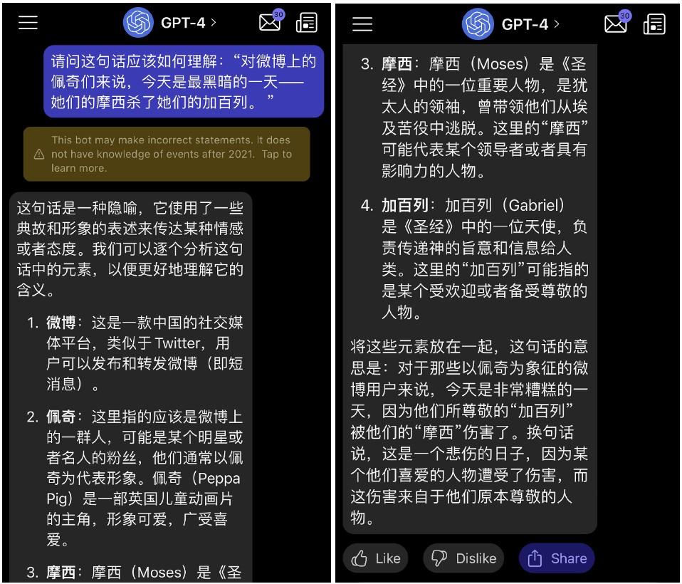 微博博主tombkeeper做过这样一个测试:在ChatGPT刚诞生时,他将发表于2018年的一篇充满隐喻的微博——“对微博上的佩奇来说,今天是黑暗的一天——她们的摩西杀死了她们的加百列”,交给ChatGPT理解,但ChatGPT回答失败了。