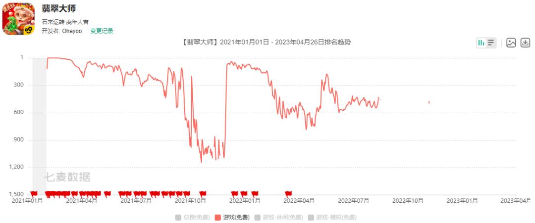 包括《翡翠大师》本身也难做长线运营,这一爆款只在春节档爆过。2021年底游戏在iOS免费榜出现排名回暖,好像又打算冲击第二年的春节档。这次排名峰值不及前一年,下滑速度也更快。产品生命周期的规律在爆款游戏身上也没有例外,游戏在今年春节不再有新动作。
