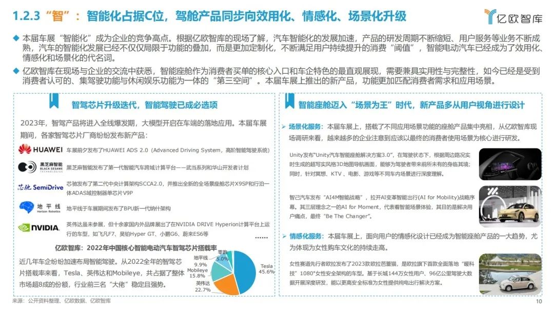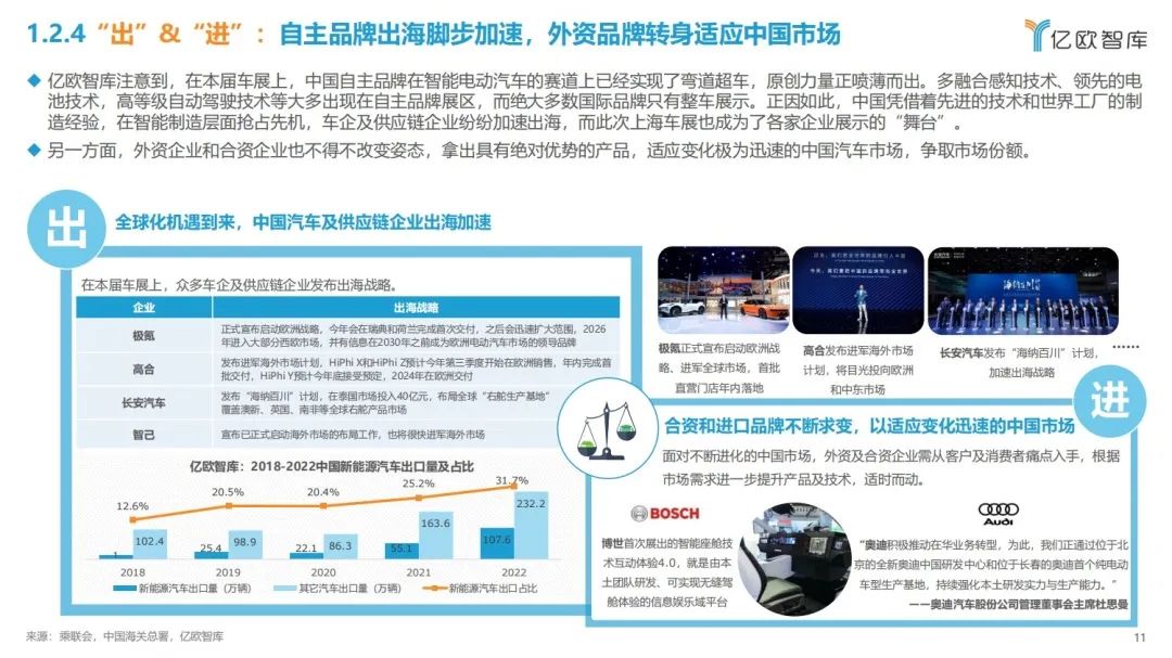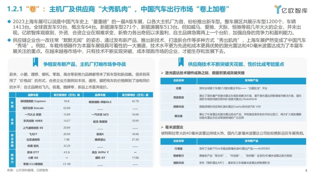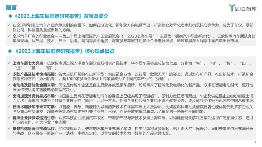 亿欧智库深入洞察参展商技术、产品、发布会等各方面,总结了本届车展的七大亮点:卷、电、智、出、进、氢、销。