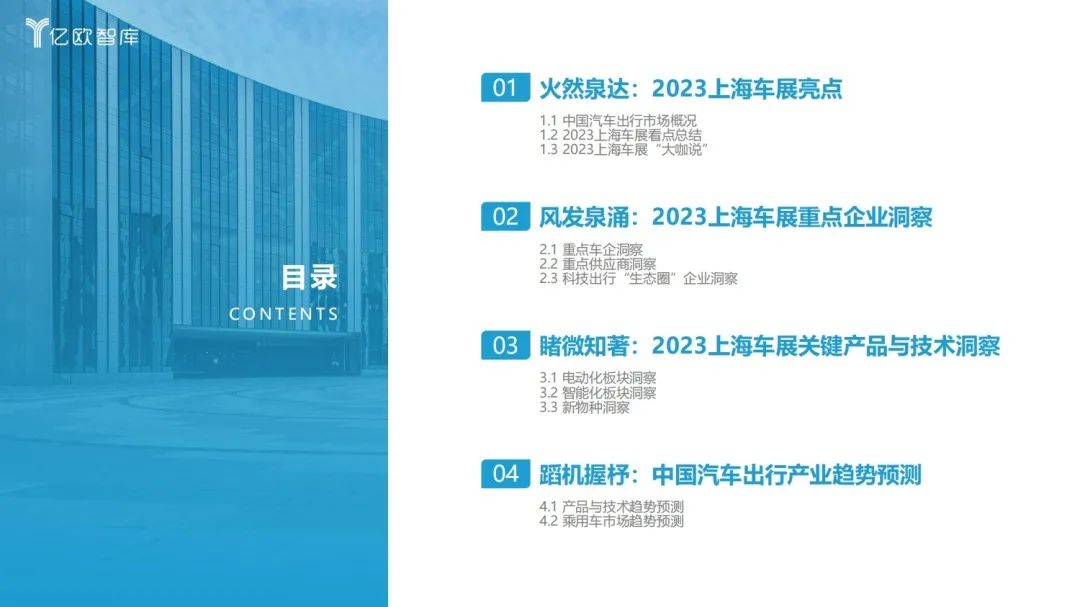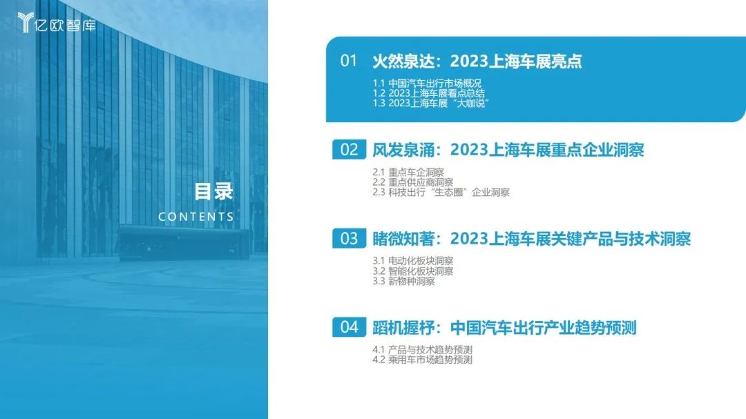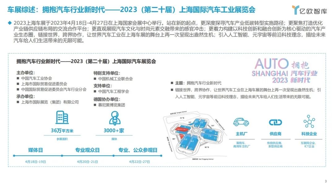 全球汽车厂商的行业盛会——第二十届上海国际汽车工业展览会(“2023上海车展”)主题为“拥抱汽车行业新时代”。亿欧智库汽车团队奔赴 车展现场,从产品、技术、产业、品牌、营销等多个角度,深度参与车展并对多个企业进行访谈,透过车展深入洞察中国汽车出行市场。
