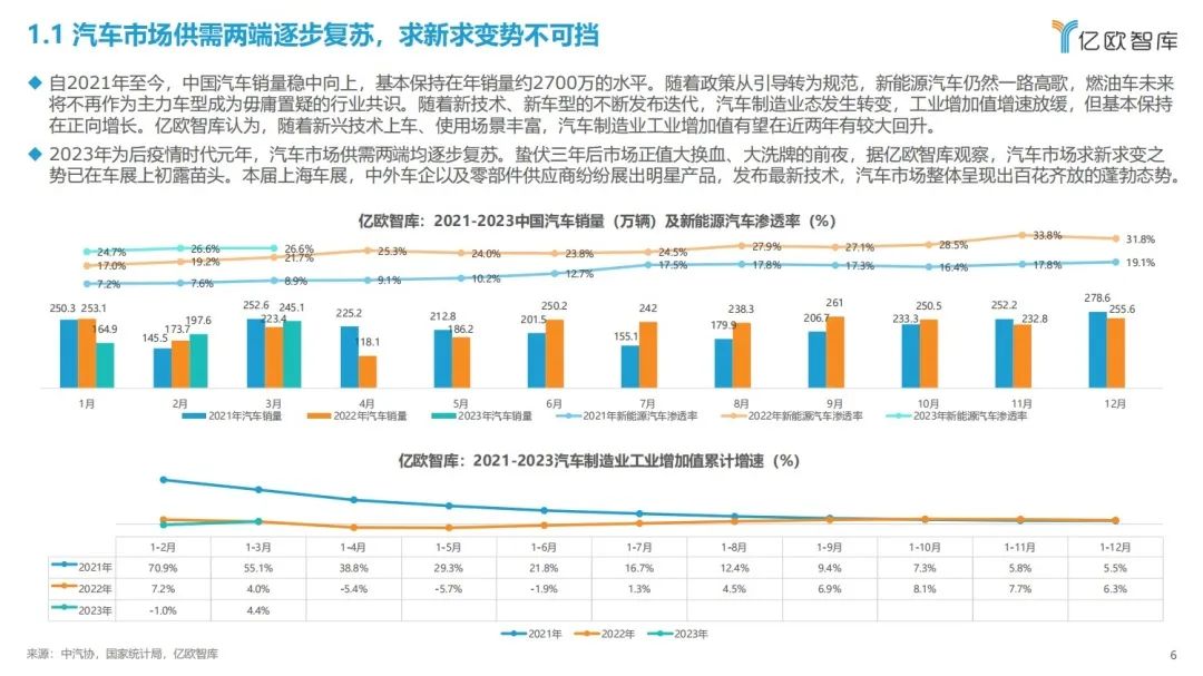 2023年为后疫情时代元年,汽车市场供需两端均逐步复苏。蛰伏三年后市场正值大换血、大洗牌的前夜,据亿欧智库观察,汽车市场求新求变之势已在车展上初露苗头。本届上海车展,中外车企以及零部件供应商纷纷展出明星产品,发布最新技术,汽车市场整体呈现出百花齐放的蓬勃态势。