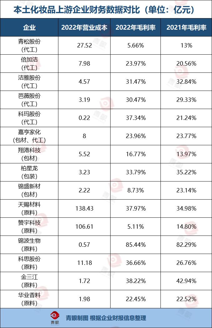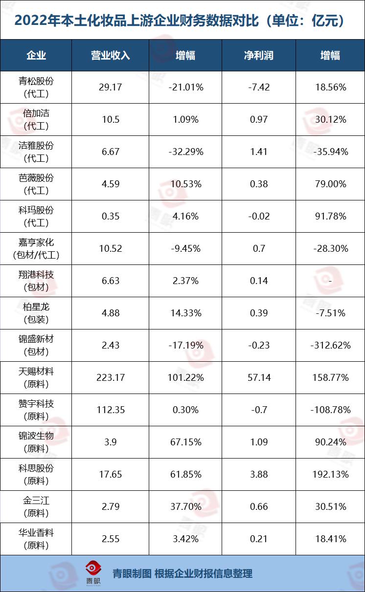 青眼进一步梳理15家本土化妆品上游企业也发现,2022年大多数代工厂、包材商净利润、营业收入出现增长乏力的现象; 多家原料商出现高两位数增长。