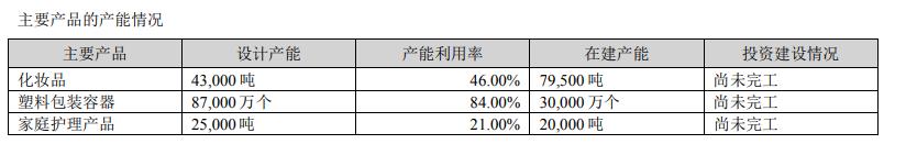 据嘉亨家化年报数据显示,截至2022年,嘉亨家化化妆品、塑料包装容器、家庭护理产品产能利用率分别为46%、84%和21%。