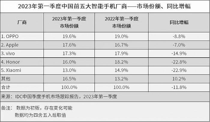 IDC的数据显示,2023年第一季度,中国智能手机市场出货量约6544万台,同比下降了11.8%。然而在市场需求下滑的大背景下,纳入一加双品牌调整后的OPPO,却以19.6%的市场份额排名国内手机市场第一。