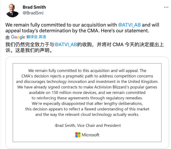 “ 不服气,还要上诉,势要收购成功!”,而且还内涵 CMA 的操作“ 阻碍了英国的技术创新和投资 ”。甚至在媒体面前直呼,这是微软在英国 40 年来“ 最黑暗的一天 ”。