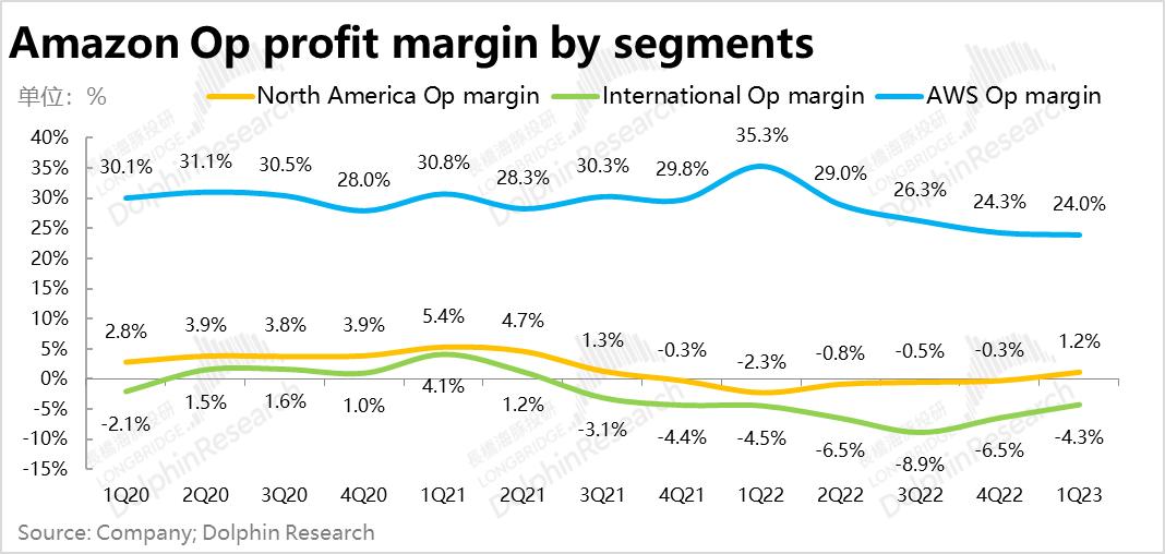 2. 最大亮点--零售板块开始扭亏:细看利润超预期的来源,AWS云的利润基本在预期之中,但北美零售板块本季实现了9亿的经营利润,相比上季2.4亿的亏损大大改善。国际零售板块的亏损也从20多亿大幅缩窄到12.5亿,两者合计比市场预期共少亏了超16亿。并且不同于上季度仅北美板块的利润在修复,本季巨亏的海外也开始好转。