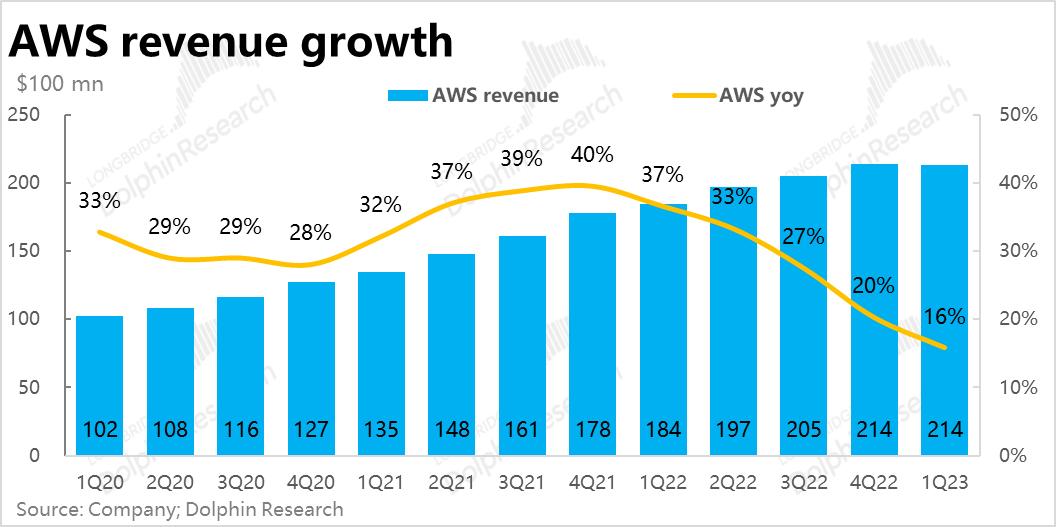 一季度AWS收入214亿美元,增速环比进一步下降4pct到20%。但更值得注意的,AWS营收绝对值本季也环比减少了0.2亿美元,是海豚君可追溯历史中的首次,反复验证了全球云服务需求滑坡的严重程度。