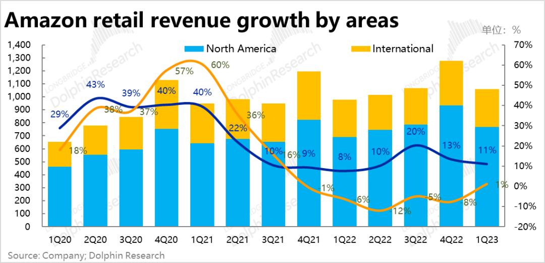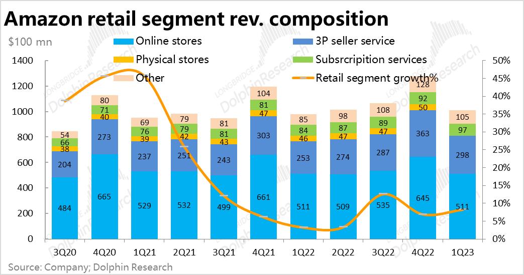但在云业务继续滑坡的同时,长期磨底的零售业务逐渐走出低谷的趋势也在继续。本季亚马逊的零售板块实现收入1060亿美元,同比增速为8%,环比上季度提升了约1pct。