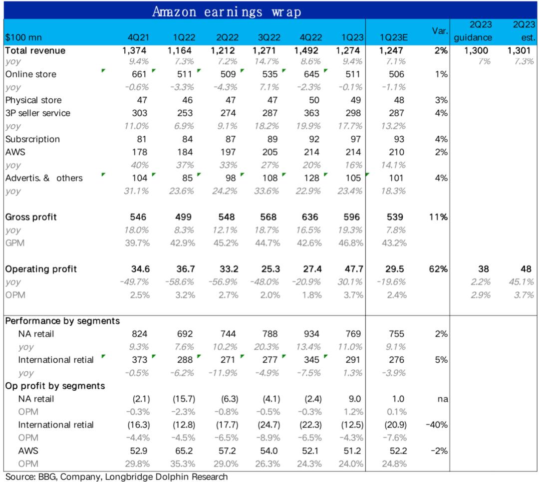 北京时间4月28日美股盘后,亚马逊公布了2023年一季季度财报,核心观感还是延续了上季度零售板块持续修复,但AWS继续滑落深渊的趋势,核心要点如下: