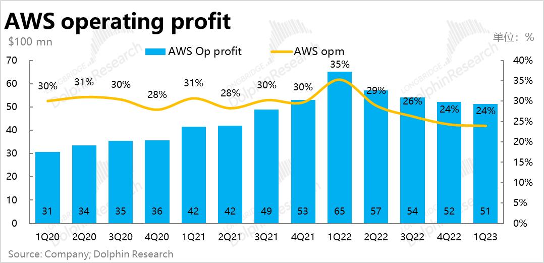 利润方面,本季AWS实现经营利润51.2亿美元,经营利润率环比维持在24%,没有再显著下滑,但也无任何超预期之处。从预期差的角度,AWS并没增量的坏消息,但从业绩趋势上,滑落仍在继续。