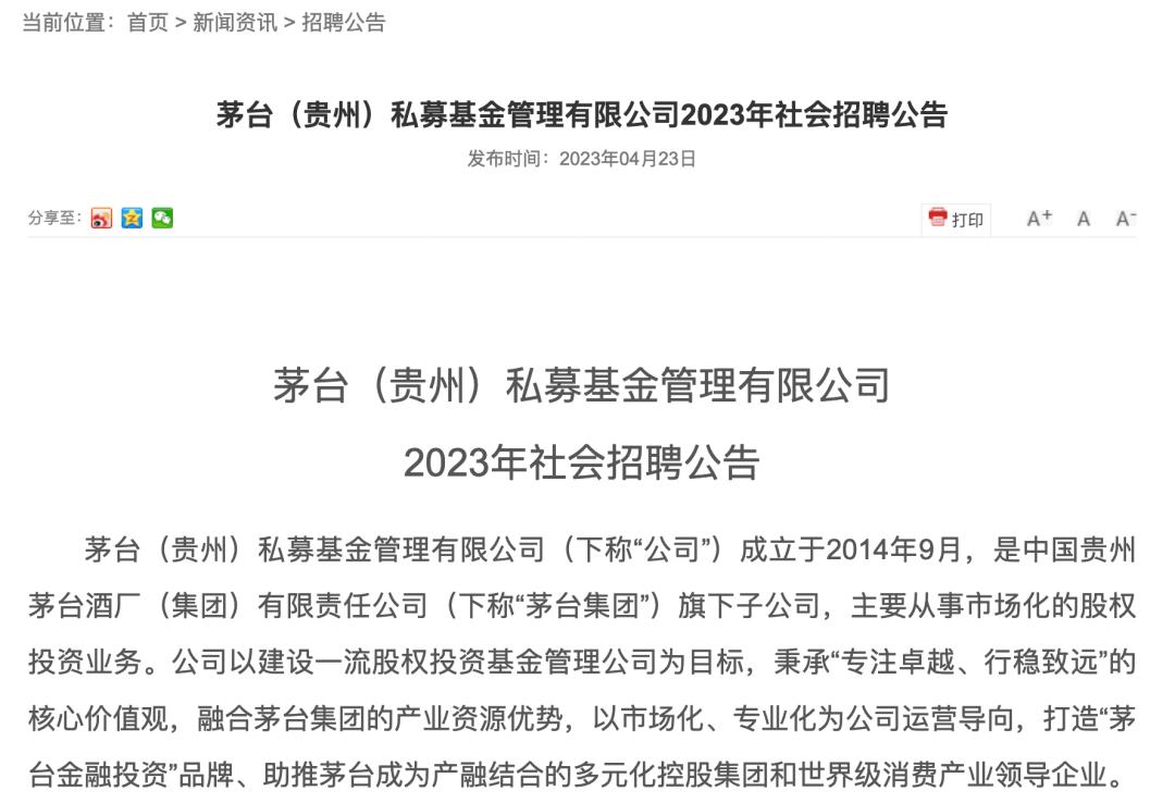在很长一段时间里,茅台的投资团队十分低调。直至此次招聘公告,外界才得以略窥一二。根据公告,茅台(贵州)私募基金管理有限公司主要招聘四个岗位,分别为:投资经理、投资者关系经理、基金法务经理、投后管理经理。