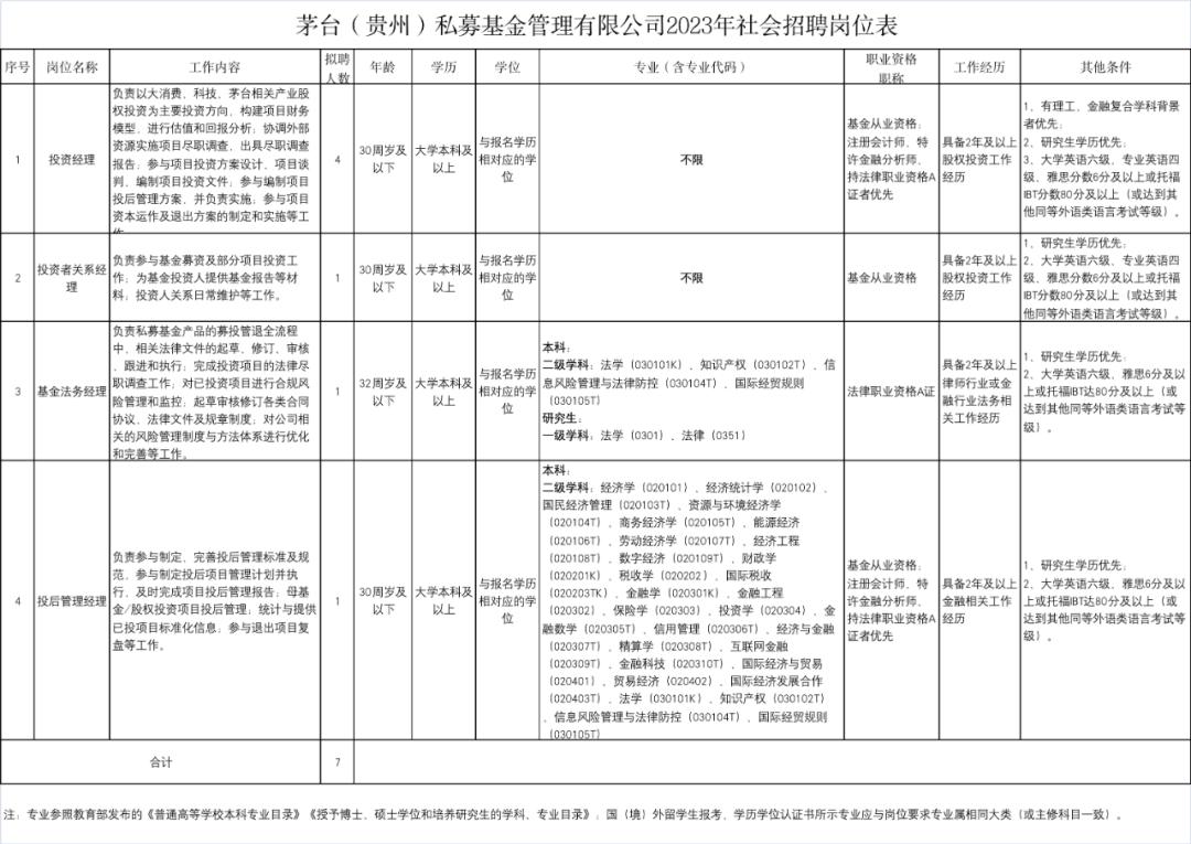 投资界从茅台集团官网获悉,本周茅台集团旗下子公司茅台(贵州)私募基金管理有限公司决定面向社会公开招聘7人,招聘岗位覆盖投资经理、投资者关系经理、基金法务经理、投后管理经理等。
