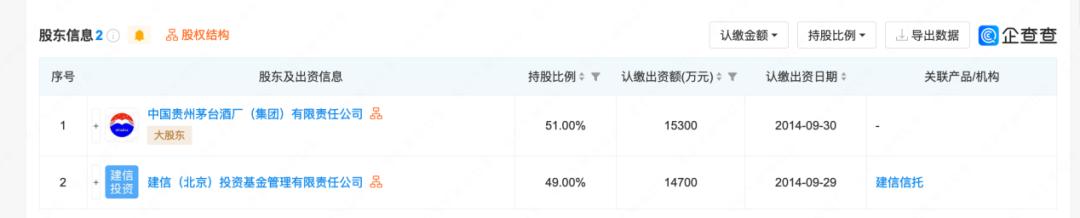 早在2014年9年,茅台(贵州)私募基金管理有限公司正式成立,曾用名为茅台建信(贵州)投资基金管理有限公司。企查查数据显示,上述基金管理公司由茅台集团与建行旗下的建信信托共同发起成立。其中茅台认缴出资1.54亿,占股51%,建信信托认缴出资1.47亿,占股49%。