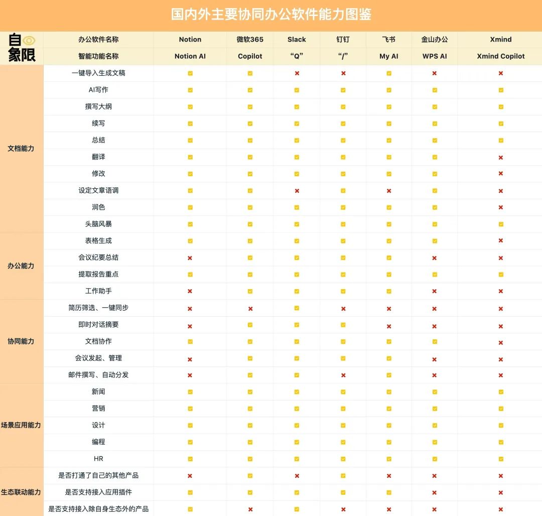 「自象限」通过测试体验、信息梳理,从文档能力、办公能力、协同能力、场景应用能力、生态联动能力五个维度来评析近期发布AI新产品的国内外七家公司,最终形成了“国内外主要协同办公软件能力图鉴”。