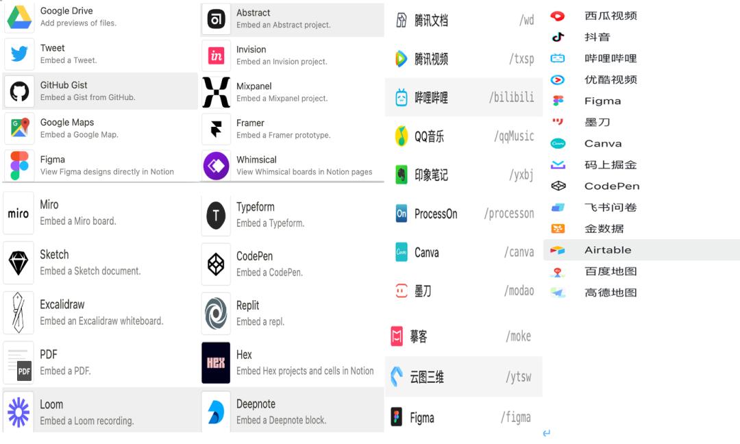 Notion近期更新了一批接入产品应用,可支持的API调取数量提升至200多个。不可否认的是,国内大公司所打造的壁垒在此刻派上了关键作用,比如腾讯文档优先支持腾讯视频、QQ音乐等腾讯系产品接入,飞书优先支持西瓜视频、抖音等字节系产品接入,但仅就数量来说还有极大的提升空间。