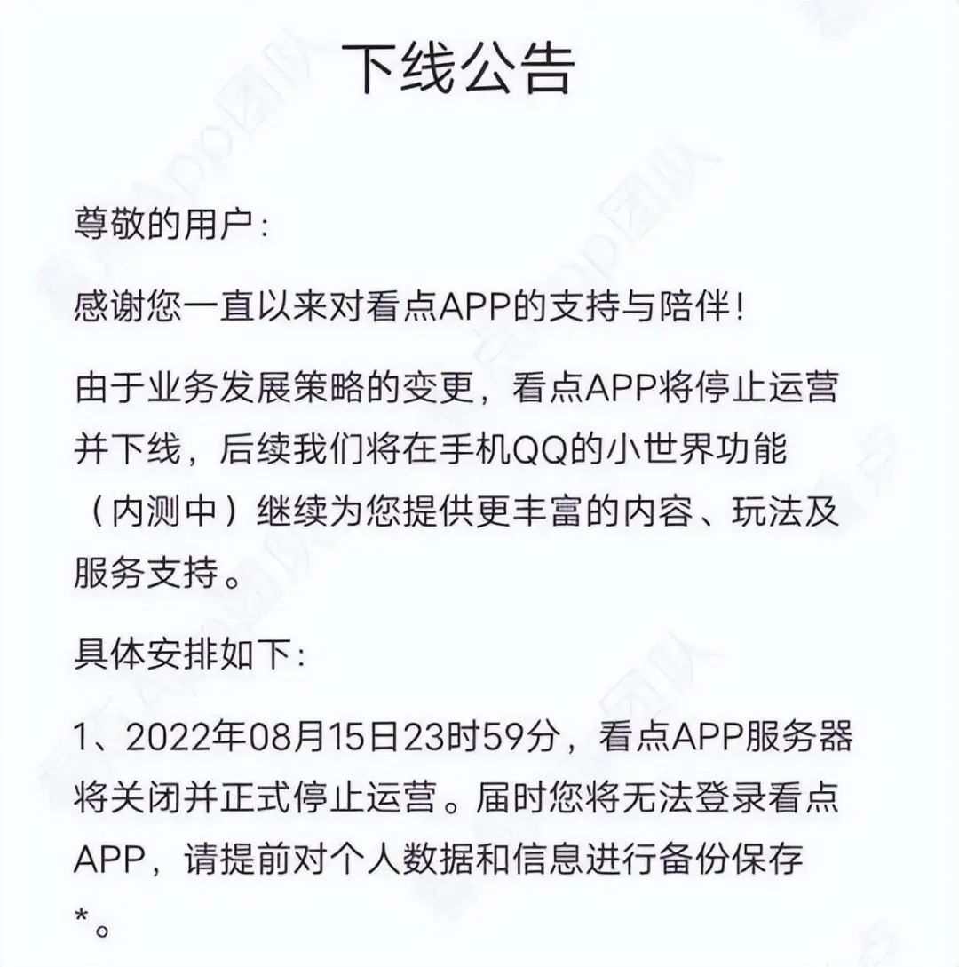 而2022年8月16日,运营了7年之久的看点APP已被关闭并正式停止运营。在高峰时期,腾讯看点的活跃用户曾达到2.4亿,并占据着QQ的一级入口位置。看点快报关停的时候,仍有700多万的月活。