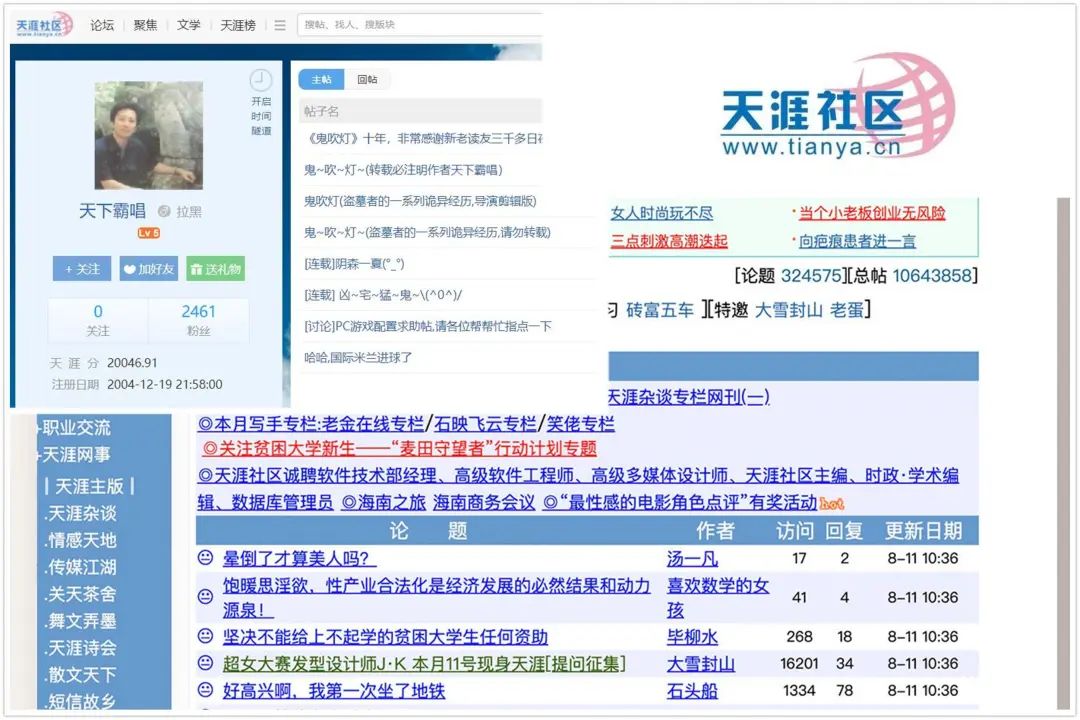 回顾那个时代,天涯社区也颇受学术界、思想界和媒体界的氛围影响,没有预设的立场与套路,形成了观点的自由市场,创作者更多是出于自由和兴趣激发出来的内容创作欲望。