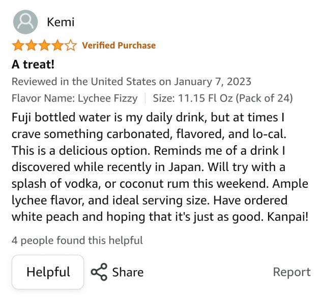 潘哥发现,在美版亚马逊上,有网友购买元气森林气泡水后,对产品给出了好评。但是,不论是开头的“富士水”,中间提到的“日本”,还是最后的日本罗马字“Kanpai”,似乎都能说明,他把中国的元气森林,当成了日本品牌。