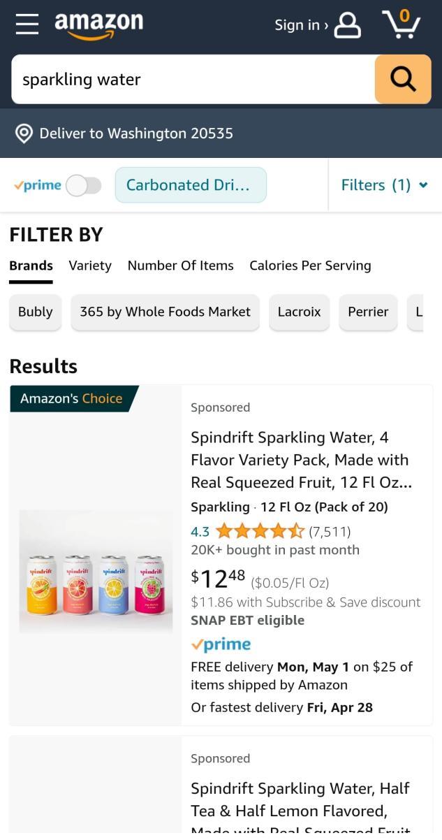 比如,在美版亚马逊上,Spindrift、Bubly、Sparkling Ice、Perrier、Lacroix等气泡水品牌,都有着不错的销量;其中355毫升的Spindrift气泡水,20瓶售价12.48美元,月销超过2万件,远远高于元气森林产品。