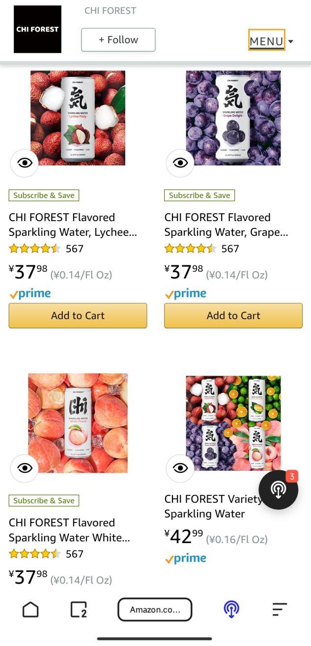 潘哥发现,在美版亚马逊上,24瓶330毫升的元气森林气泡水,分为荔枝、菠萝、白桃、葡萄四种口味,售价均为37.98美元,月销超过500件。