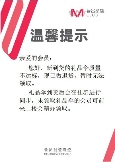 《零售圈》注意到,在今天开业时,大润发M会员商店出现了一个不应该出现的“品控”不严的问题。据通告显示,新到货的礼品伞质量不达标,现已做退货,暂时无法领取。
