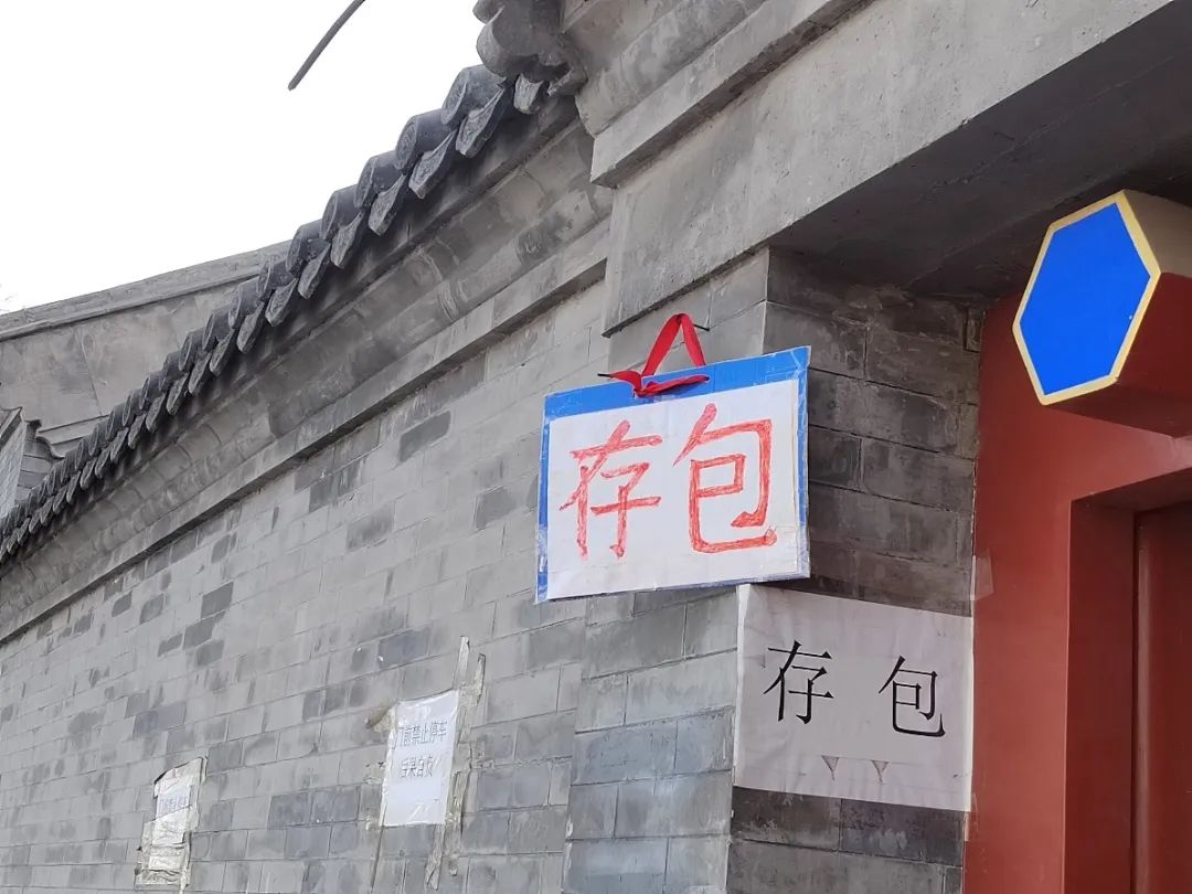 从地铁站到雍和宫的必经之路上有一处民宅,一开始只是用A4纸打印了黑色的“存包”二字贴在墙内侧,可能是怕不够醒目,又找来一块废旧蓝底瓦楞纸,把文字换成醒目的红色,钉在外墙上。红色的字和蓝色的瓦楞纸,倒与红色的院门和蓝色的门簪,形成了色彩上的呼应。