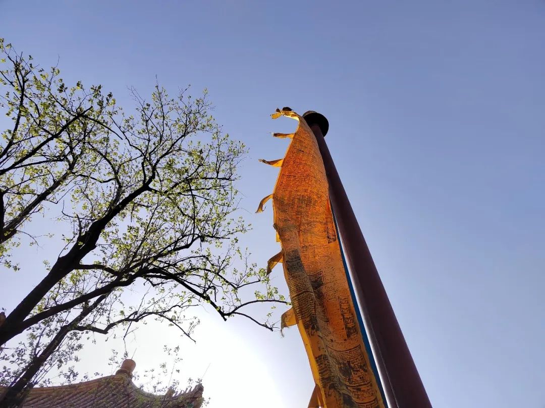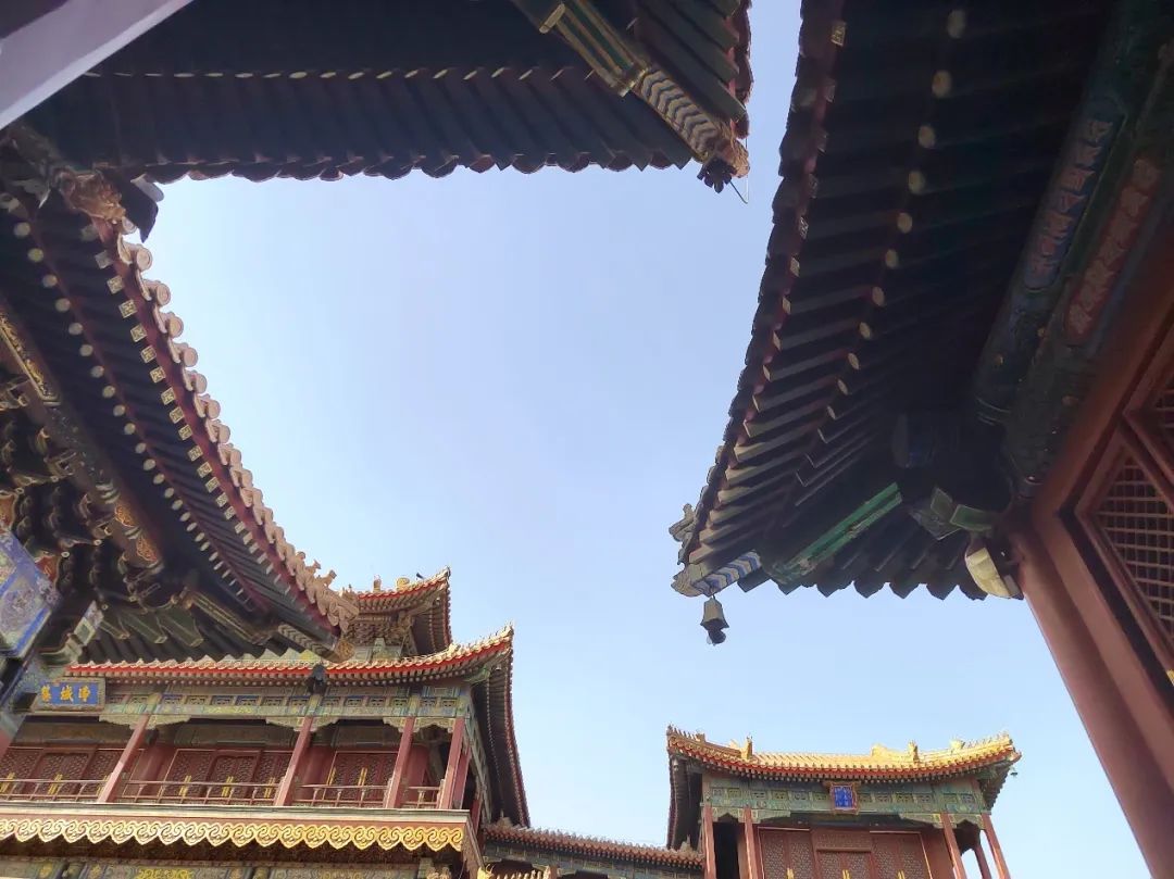 雍和宫游客众多,殿外充斥着各种声音——小孩子跑来跑去,大人们交谈或打电话,梳着长长麻花辫的藏族阿姨坐在长椅上用藏语聊天,大风刮过,风马旗顶上的铃铛和房角屋檐下的铃铛一同作响。