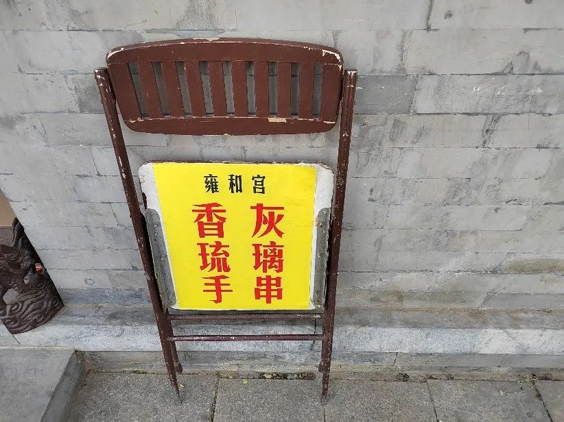 不想把招牌张贴在墙上的商家,干脆把广告贴在折叠椅的坐垫背面。叠起来靠在墙边时,露出“雍和宫香灰琉璃手串”几个大字;不需要时,把椅子翻下,广告自然被隐藏,变成饭后闲坐的地方,完成来无影去无踪的变身法术。