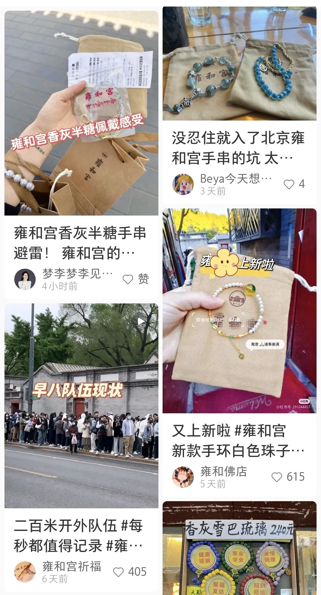 社交媒体是在年轻人中“捧红”雍和宫手串的最大助力,抖音话题#雍和宫香灰琉璃的播放量高达1.5亿次,小红书的雍和宫相关笔记高达19万篇,比前任网红景点南锣鼓巷多出5万篇。小红书的19万篇笔记中,4万篇和雍和宫手串相关,博主们纷纷晒出手串照片,分享自己排队2个小时的战果。