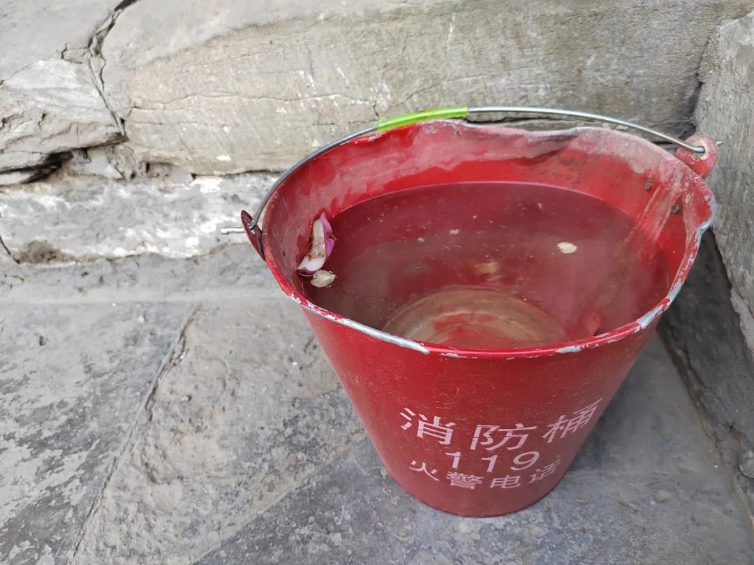 玉兰已经谢了,玉兰花瓣被风吹到殿外的消防桶里,图源作者