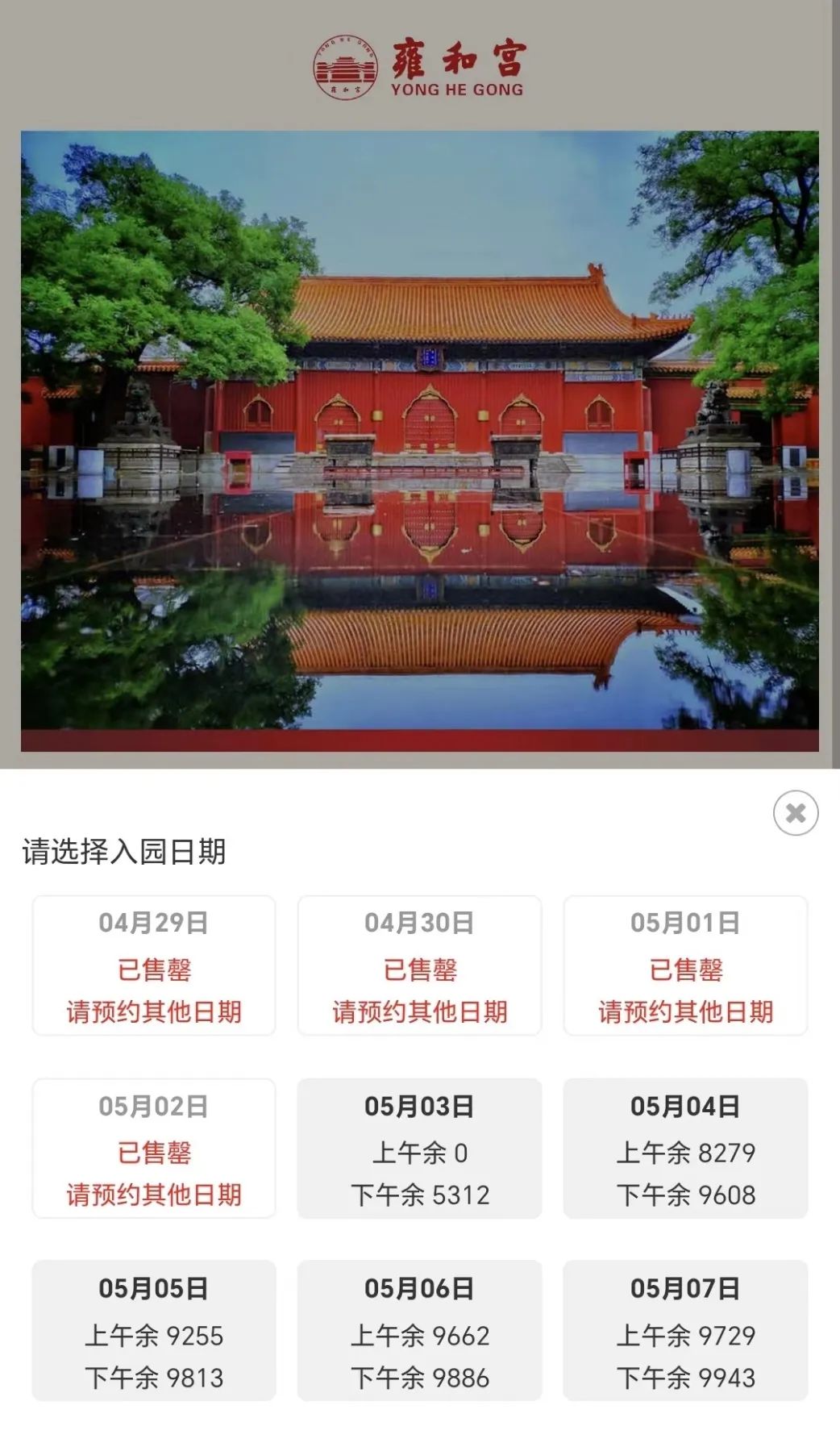 抖音话题#雍和宫香灰琉璃的播放量高达1.5亿次;小红书的雍和宫相关笔记多达19万篇;雍和宫4月29日到5月2日的门票全部售罄;电子地图上的雍和宫大街,从早到晚都堵成“猪肝红”。