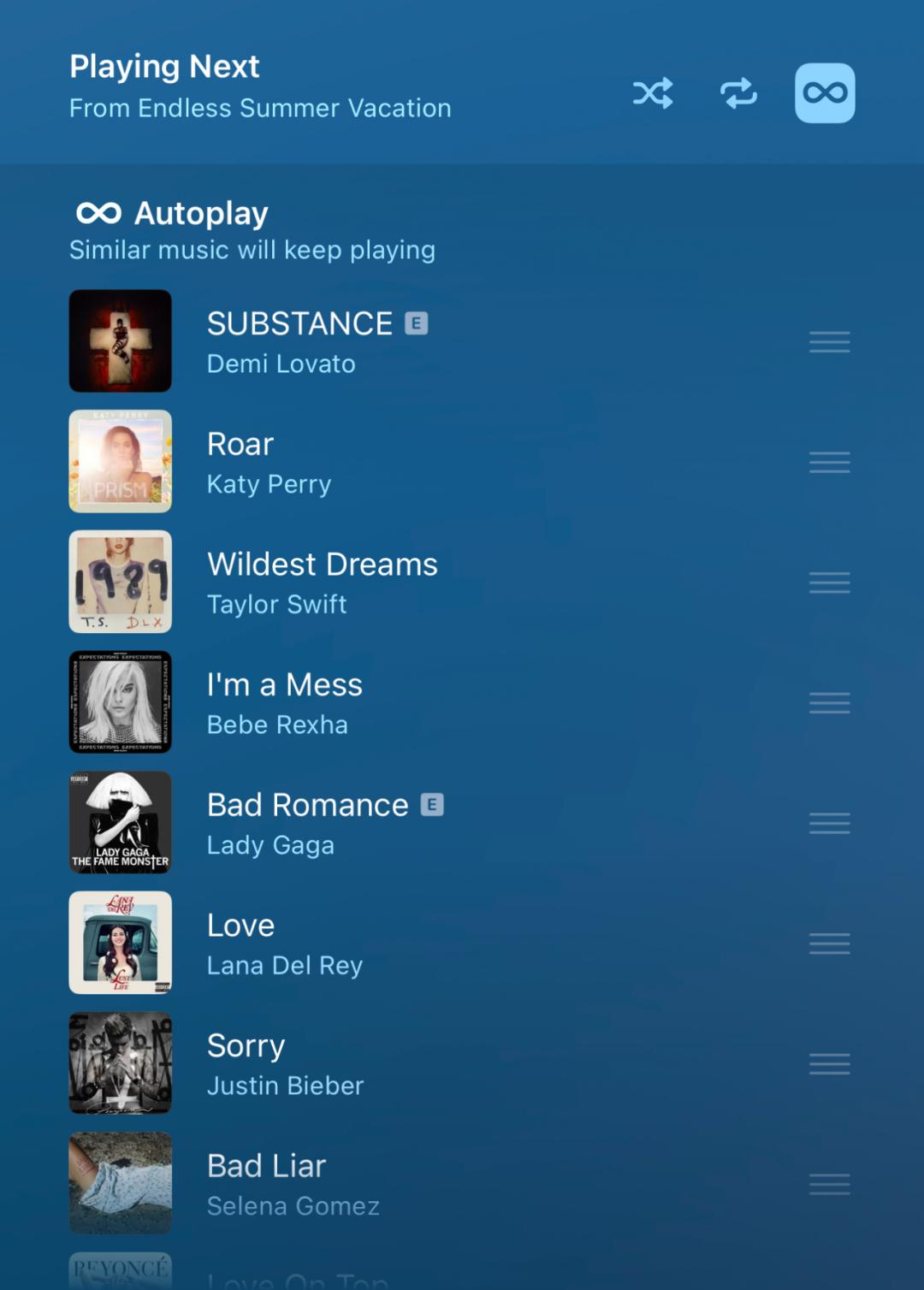包括 Apple Music,早期极力宣传自己的歌单都由真人编辑,而非算法生成。但在 2021 年,苹果也推出了「自动播放」功能。这个功能与 Spotify 的算法系统类似,会在用户播放一张专辑、歌单后,继续自动播放算法推荐的歌,无限续播下去。