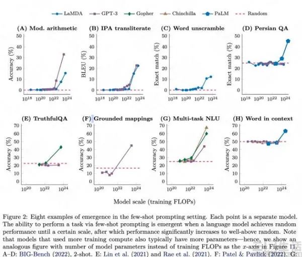 涌现能力从何而来呢,根据Google&Deepmind联合发布的相关论文显示,模型在没有达到一定规模前,得到的表现较为随机,但在突破规模的临界点后,表现则会大幅度提升。