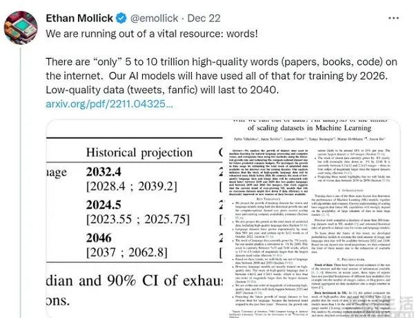 AI研究团队Epoch在今年年初发表的论文表明,AI不出5年就会把人类所有的高质量语料用光。而且这一结果,则是Epoch将人类语言数据增长率,即全体人类未来5年内出版的书籍、撰稿的论文、编写的代码,都考虑在内预测出的结果。