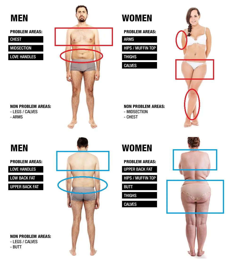 从身型上来看,男性脂肪分布相对集中,属于「苹果型」身材;而女性的身材更偏向「梨形」,脂肪的分布也更分散。这也是造成男女减脂前后,视觉效果差异的一大原因。