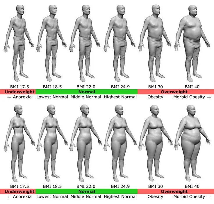 不同BMI水平下男女体型的差异。图源: Pinterest