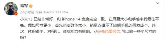 雷军并没有避而不谈,而是正面回应,他表示:“小米 13 已经非常好了,和 iPhone14 宽度完全一致,在屏幕大小和手感中找平衡。假如尺寸更小,首先消费者群体太小,销量支撑不了旗舰手机的研发成本。其次,体积很小,对相机、续航能力有影响”。