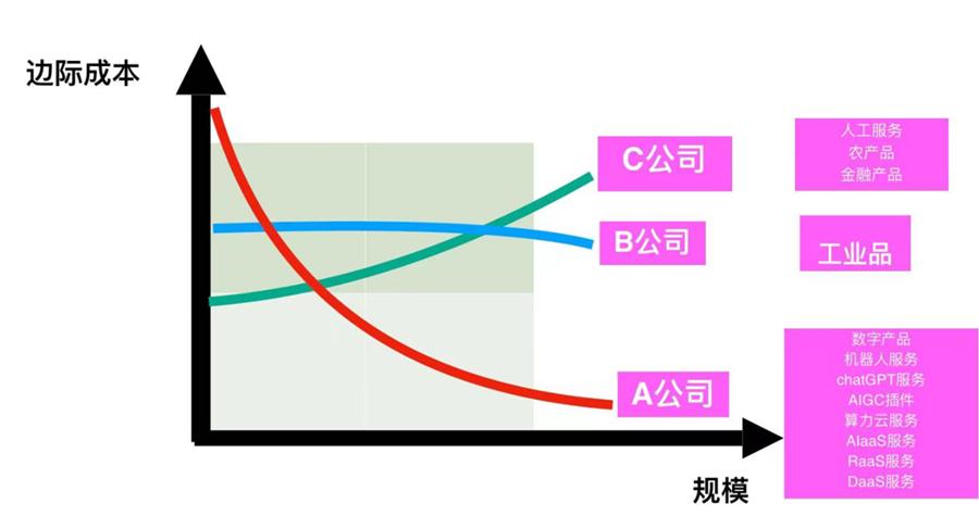 从农业文明时代到今天, C曲线的公司占据主流,他们依靠大量人工服务。随着规模越来越大,因为规模不经济、管理不善的原因,边际成本会越来越高。