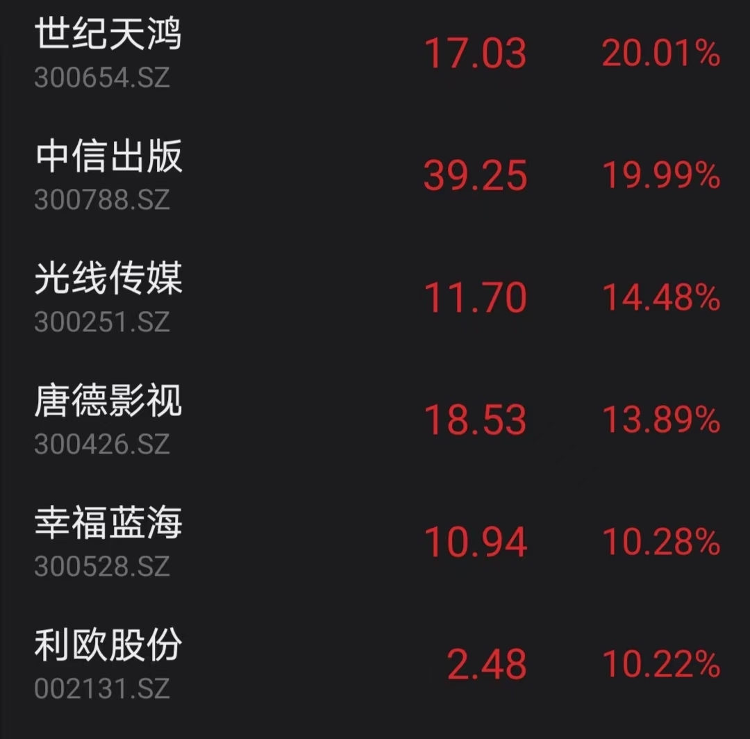 午后,影视传媒股再掀涨停潮,中信出版、中国出版、南方传媒、城市传媒、凤凰传媒等近20股集体封板,世纪天鸿、唐德影视、光线传媒、川网传媒等涨超10%。消息上,五一电影票房亮眼。统计数据显示,截至北京时间5月3日24时,2023年“五一档”电影总票房超15亿元人民币,跻身中国影史“五一档”票房第三位。