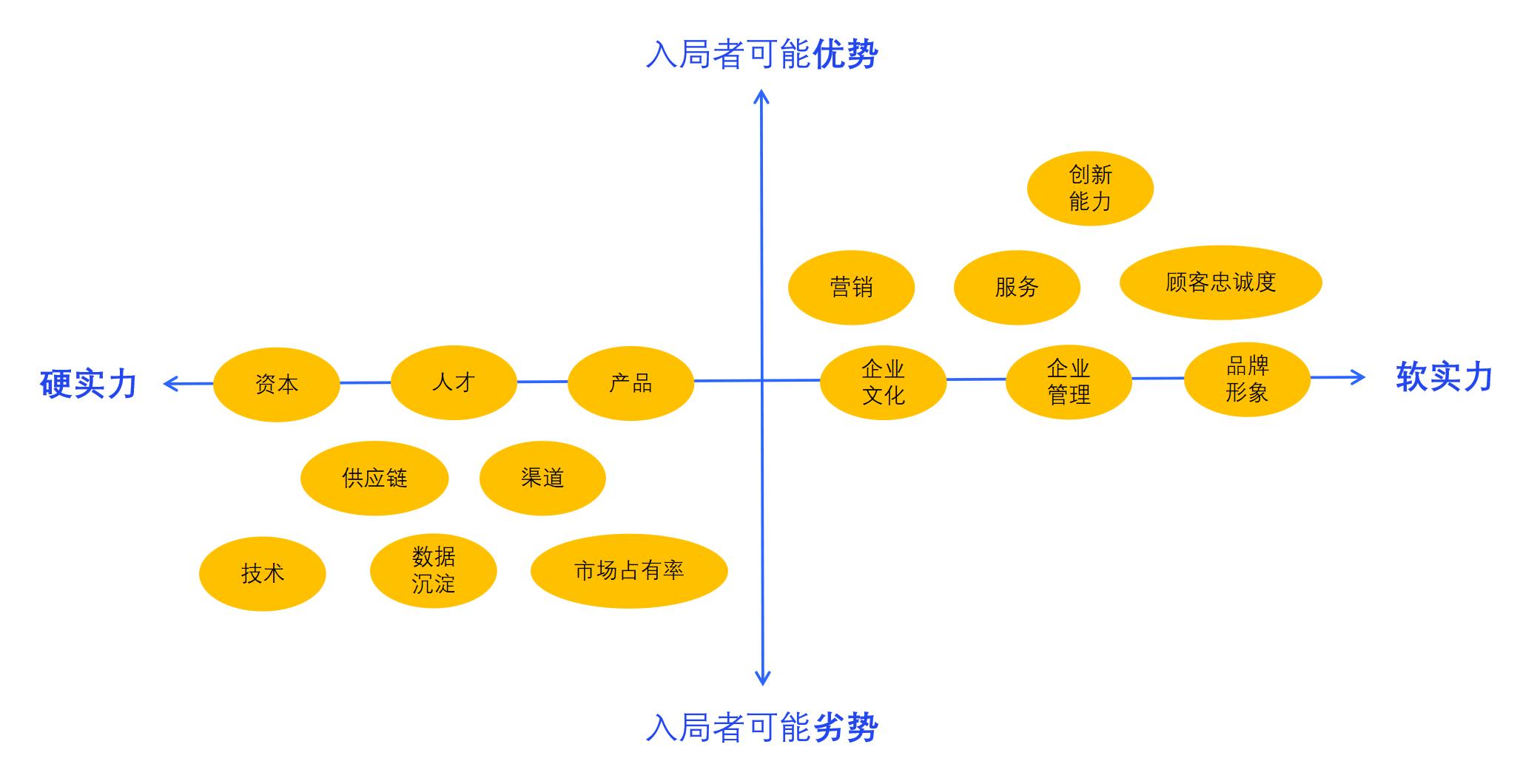 前面提到了内卷,主要是指价格竞争,这一点确实存在,但并不是今天所要分析的。以下我把企业竞争力分为硬实力和软实力(个人观点,可以探讨),并站在新入局者的角度选择有代表性的三项软实力,分析其可能得优势。