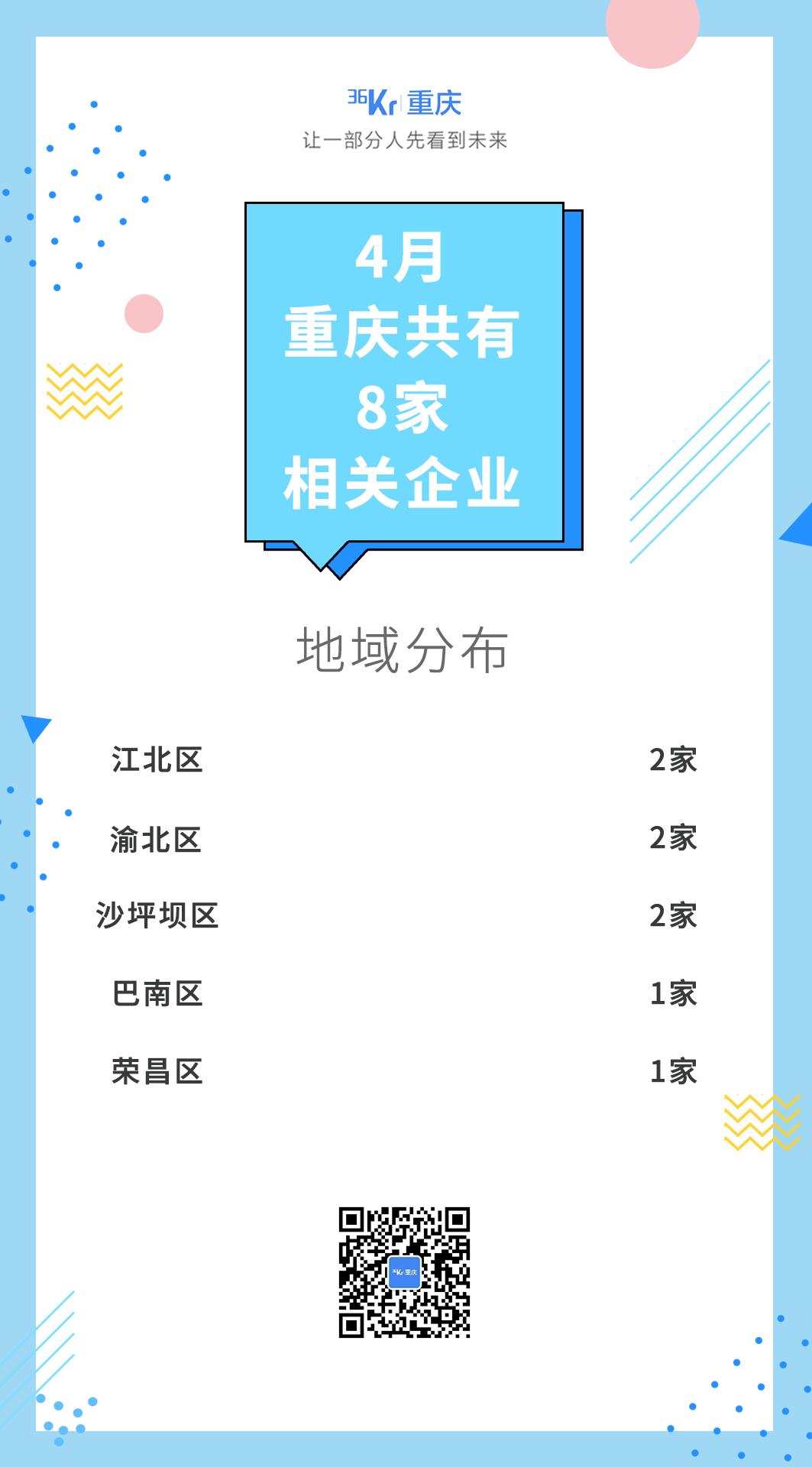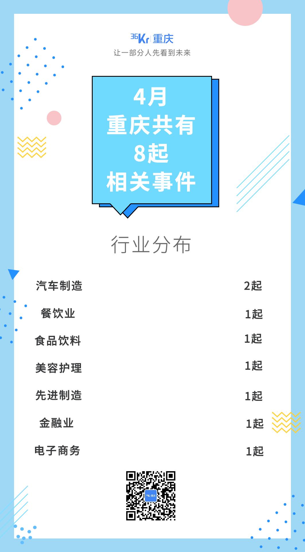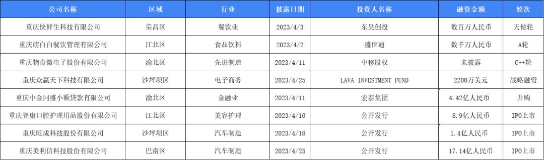 4月,36氪重庆通过天眼查查询,共收录与重庆相关的投融资事件8起,相关企业8家。其中:天使轮1家,快鲜生;A轮1家,萌白白;C++轮1家,物奇微电子;战略融资1家,众赢天下;并购1家,中金同盛;IPO上市3家,登康口腔、旺成科技和美利信。