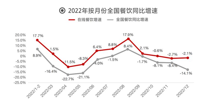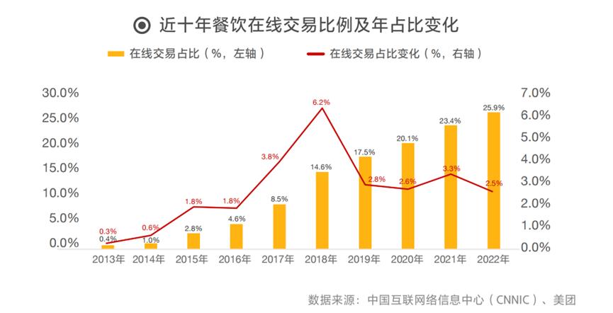 2022 年,全国在线餐饮销售额比上年增长约 2.9%,相较于全国餐饮销售额下降 6.3%,在线餐饮展现出了更加强韧的生命力,更快的市场恢复能力。