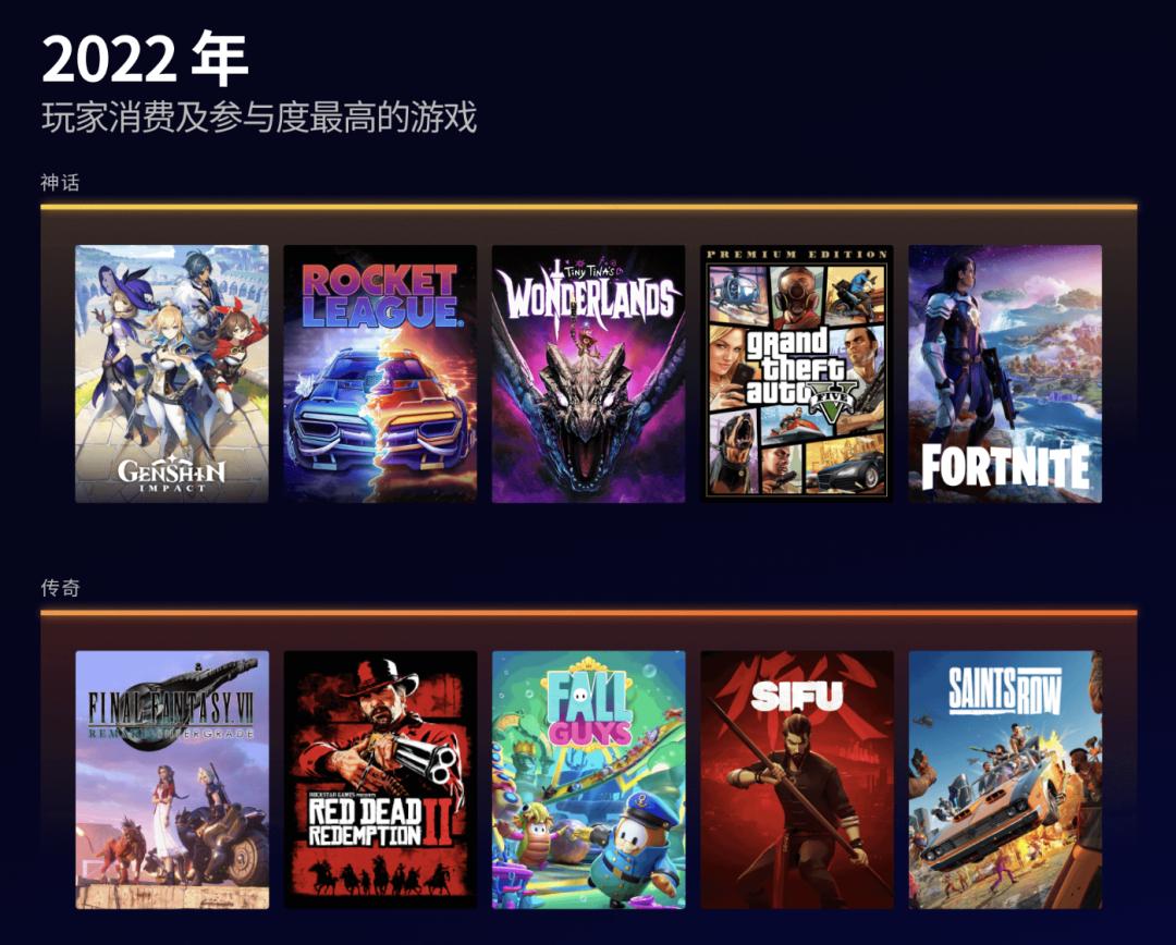 这个平台大家其实都很熟悉,那就是Epic游戏商城——这是《崩坏:星穹铁道》和《原神》除了官方渠道之外,唯一在全球上架的第三方PC端平台。可不要以为它存在感不强,实际上在2022年,《原神》是Epic游戏商城里玩家消费最高的产品之一,和《GTA5》《堡垒之夜》一起被划入了“神话”行列。