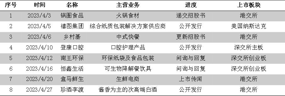 2023年4月,新消费领域共有8起IPO相关事件。其中,有3家公司上市;火锅食材品牌“锅圈食品”递交招股书、中式快餐“乡村基”更新招股;同时,据彭博社报道,盒马鲜生正与中金、摩根士丹利等机构合作,最快明年在香港上市。相比3月份注册制窗口期,本月IPO相关事件大幅减少。