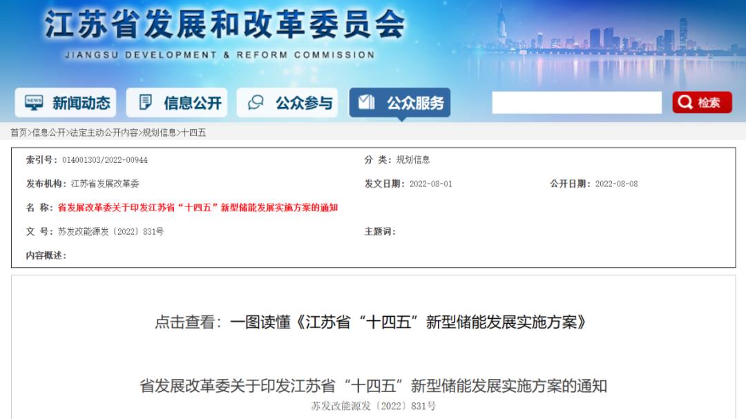 8月,《江苏省“十四五”新型储能发展实施方案》印发,明确发展目标:到2025年,新型储能由商业化初期步入规模化发展阶段,具备大规模商业化应用条件。按照“统筹规划、开放多元、市场主导、安全规范”的原则,与电力系统各环节融合发展,全省新型储能装机规模达到260万千瓦左右,为新型电力系统提供容量支撑和灵活调节能力,促进能源清洁低碳转型。市场环境和商业模式逐渐成熟,实现新型储能技术多元化发展。