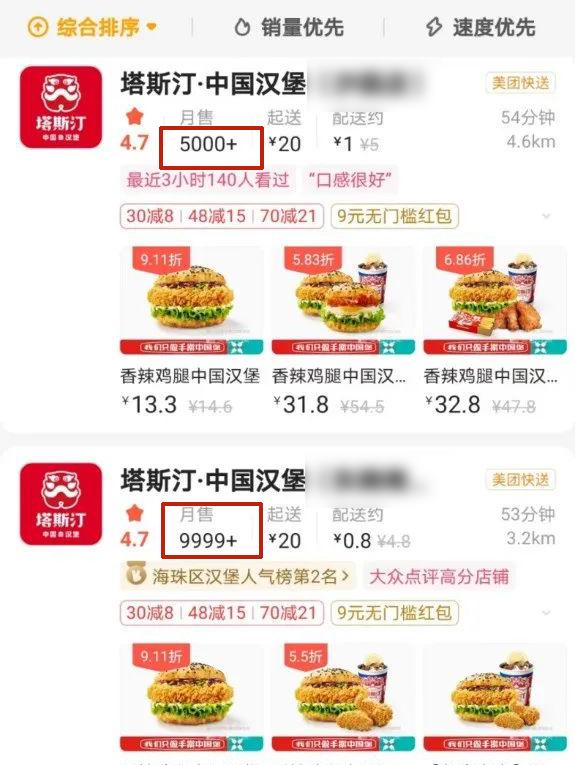 打开外卖平台也可以看到,部分塔斯汀的门店月销数普遍在5000+、8000+、9999+。